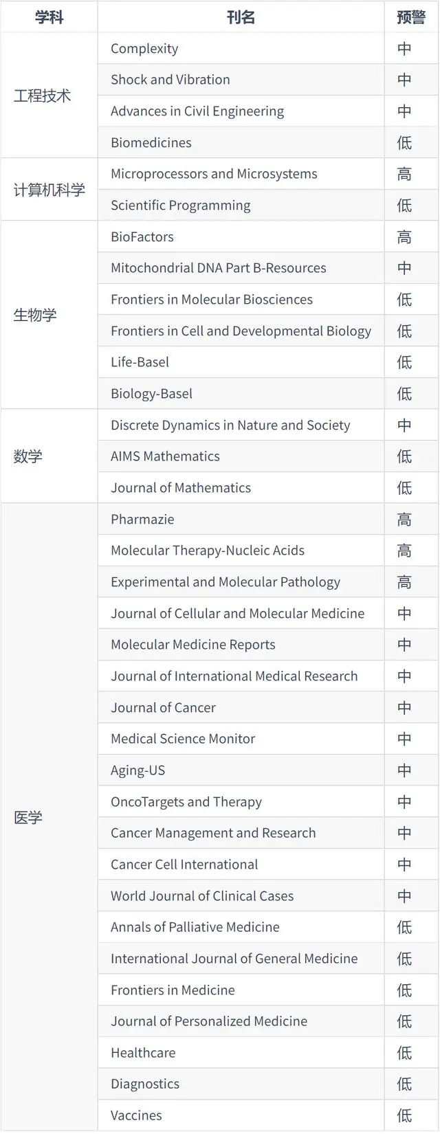 中科院2021年《国际期刊预警名单》