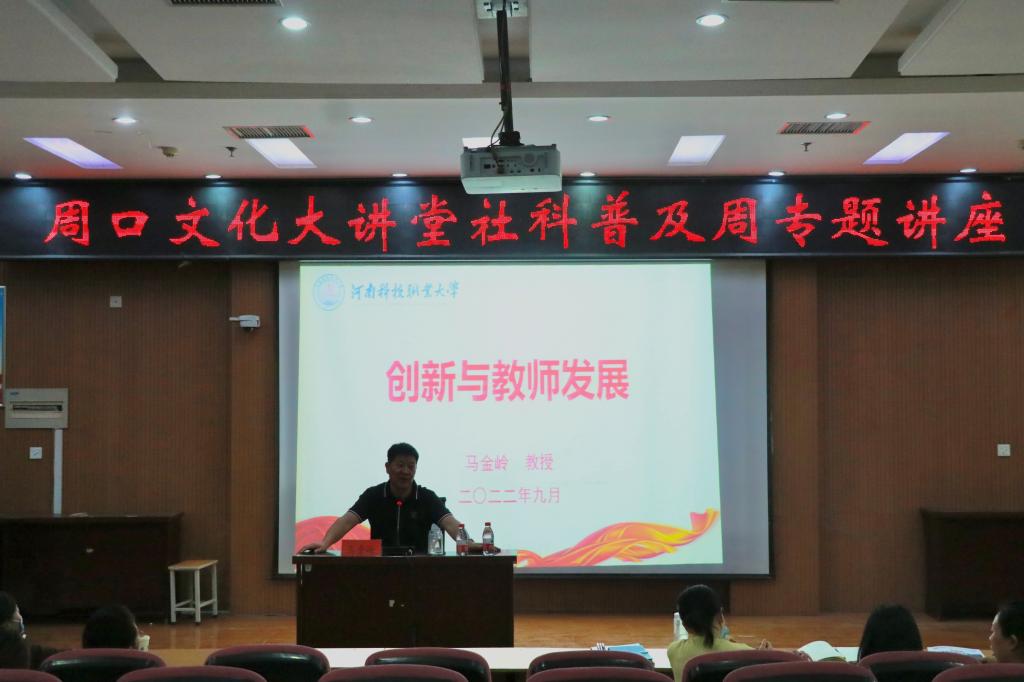 2022年9月27日下午三时,按照中共周口市委宣传部、周口市社科联关于2022年全市社科普及周活动暨yl6809永利2022年度哲学社会科学学术活动专题讲座的安排。yl6809永利常务副校长马金岭教授以《创新与教师发展》为题,于学校综合楼一楼软座报告厅为师生作了一场丰富精彩、值得深思的专题讲座,近200多名师生聆听了报告会,现场反响热烈。
