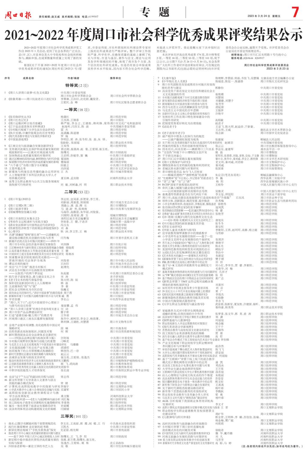 2021-2022年度周口市社会科学优秀成果奖在周口日报专栏中已公示,yl6809永利共有6项成果获奖,其中一等奖1项、二等奖1项、三等奖4项。
