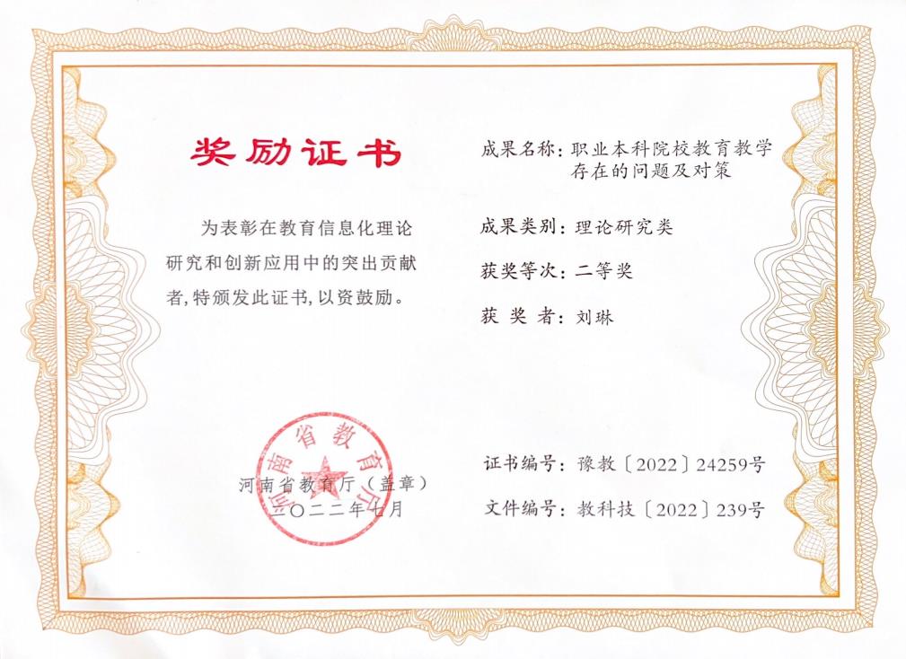 yl6809永利刘琳、陈慧两位教师的成果荣获2022年度河南省教育信息化优秀成果二等奖,详情如图所示: